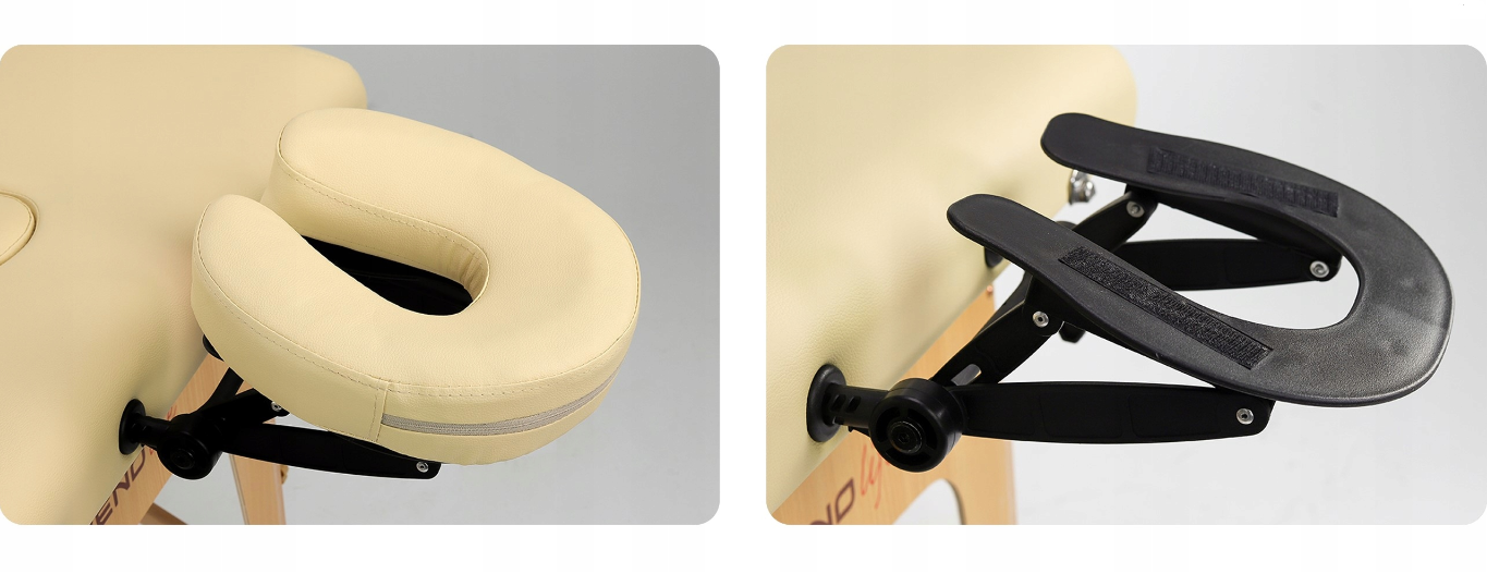 цей підголівник підходить для масажного стола з дерев'яною рамою. Кут нахилу вільно регулюється й може бути легко складається під час транспортування. Підголівник обладнаний липучками для кріплення шайби.